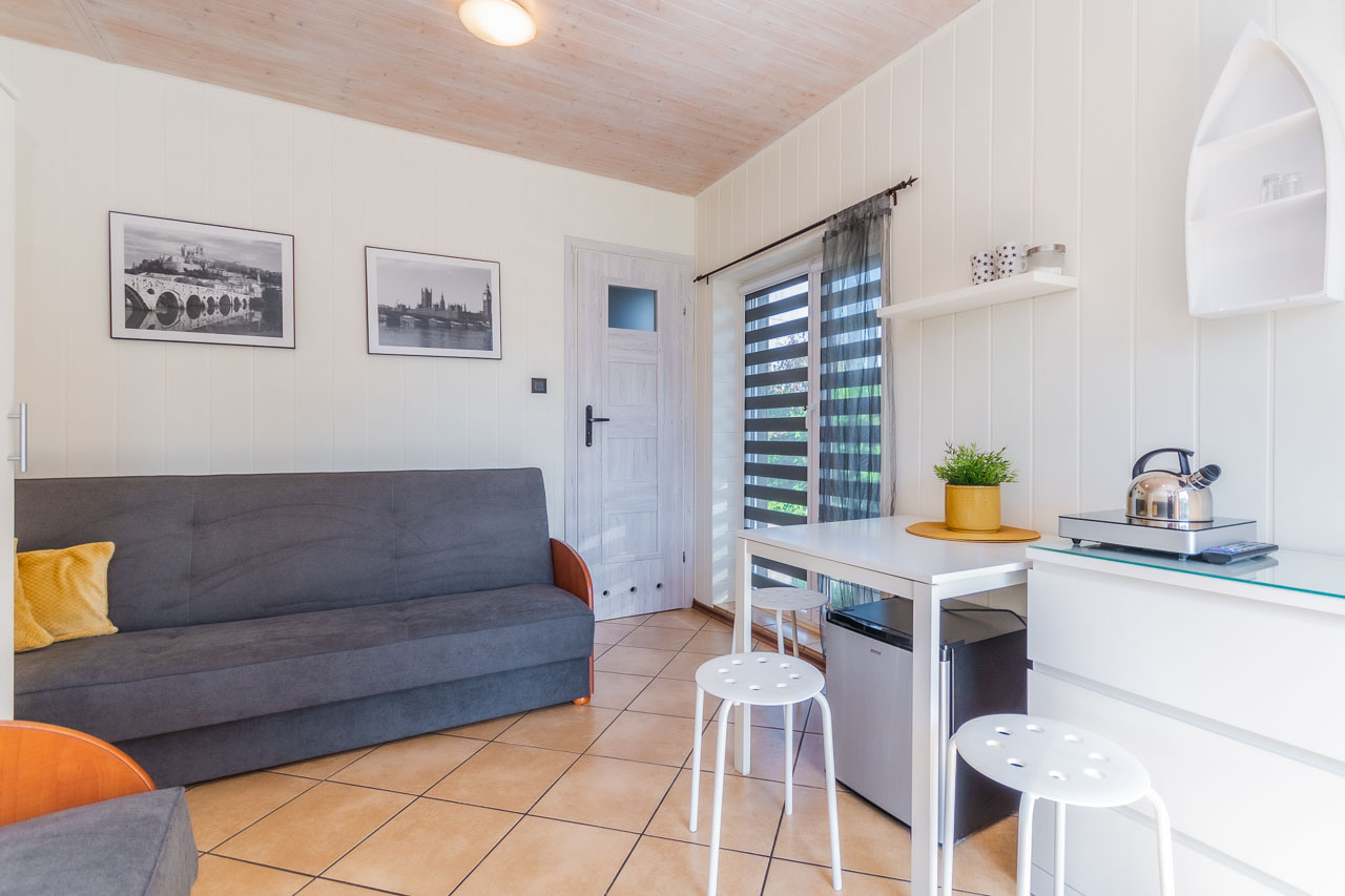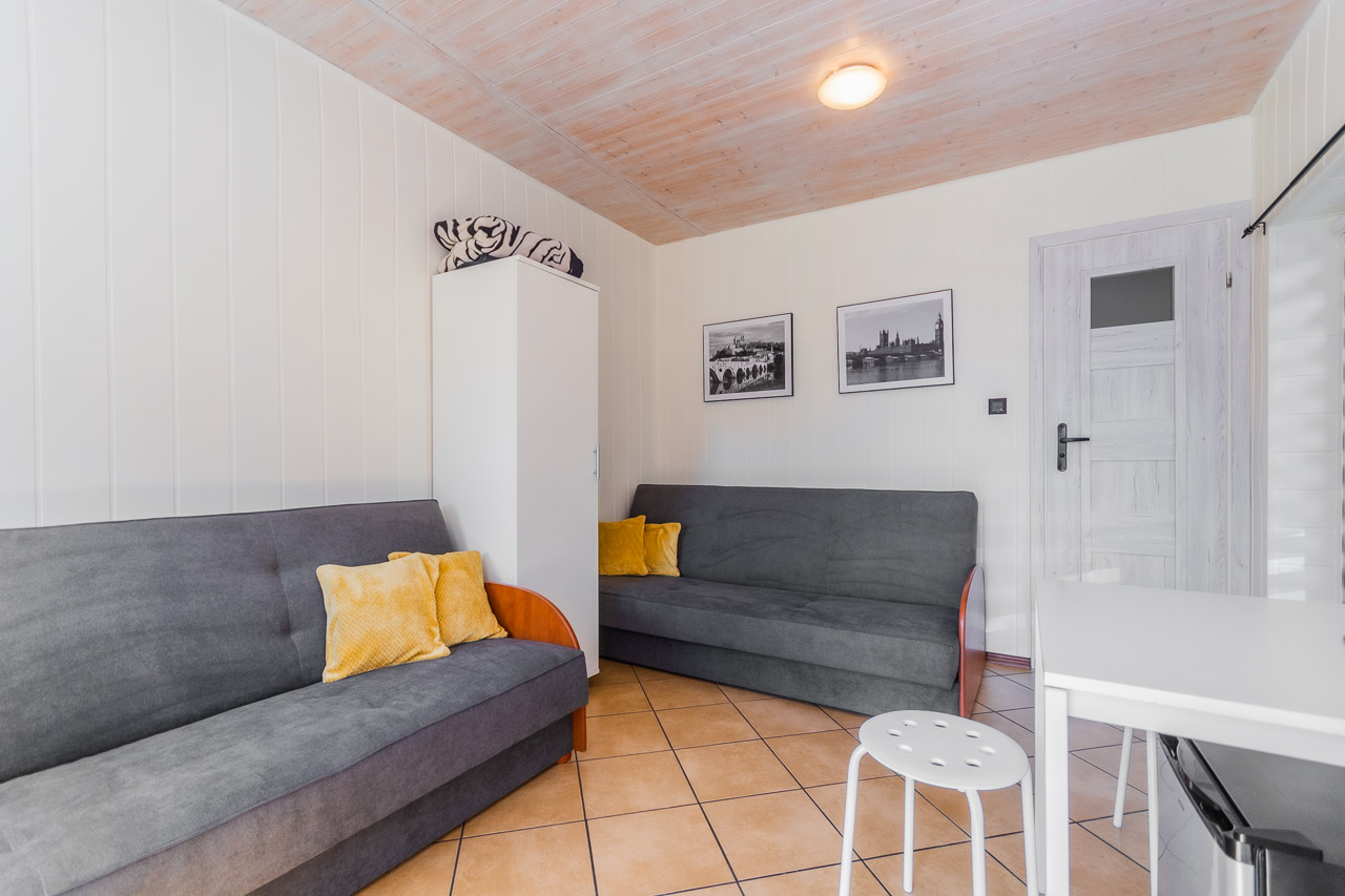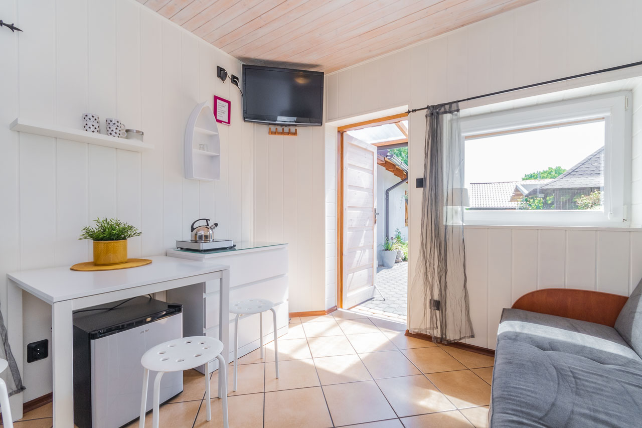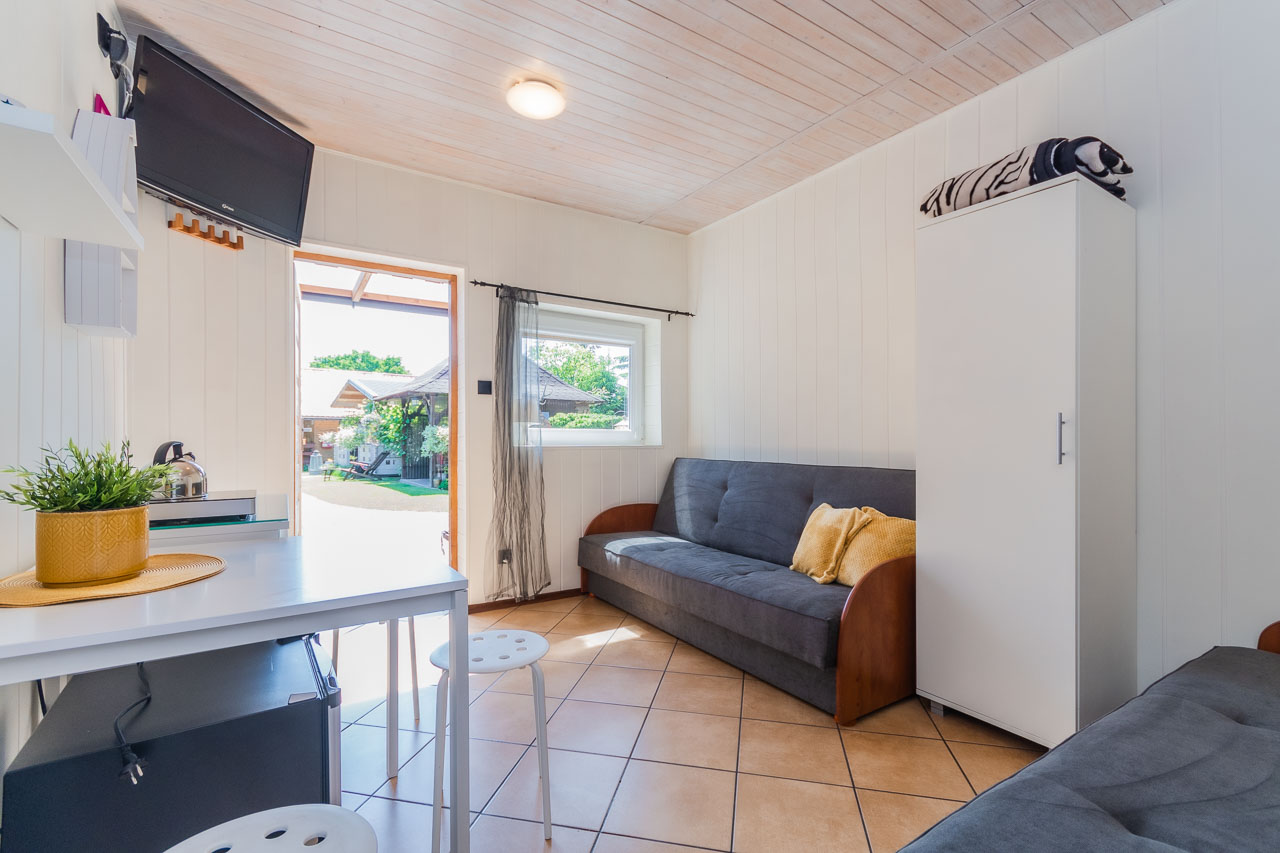 Przestronny jasny pokój przeznaczony dla czterech osób, z wyjściem od południowej stront posesji. Tuż przy drzwiach wejściowych znajduje się stół z krzesłami gdzie można korzystać z kąpieli słonecznych.