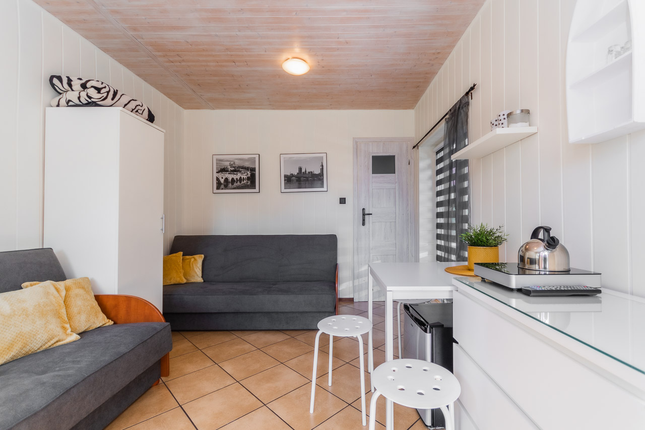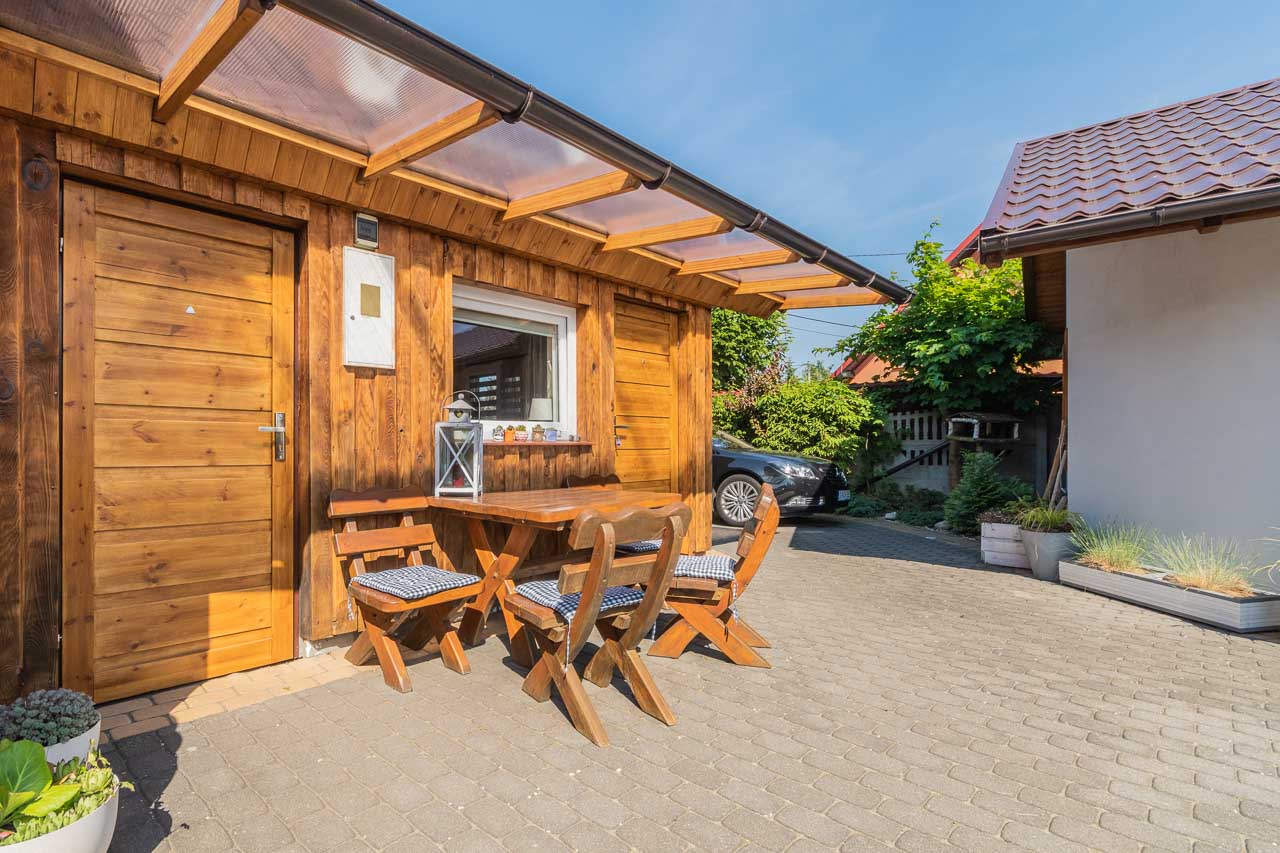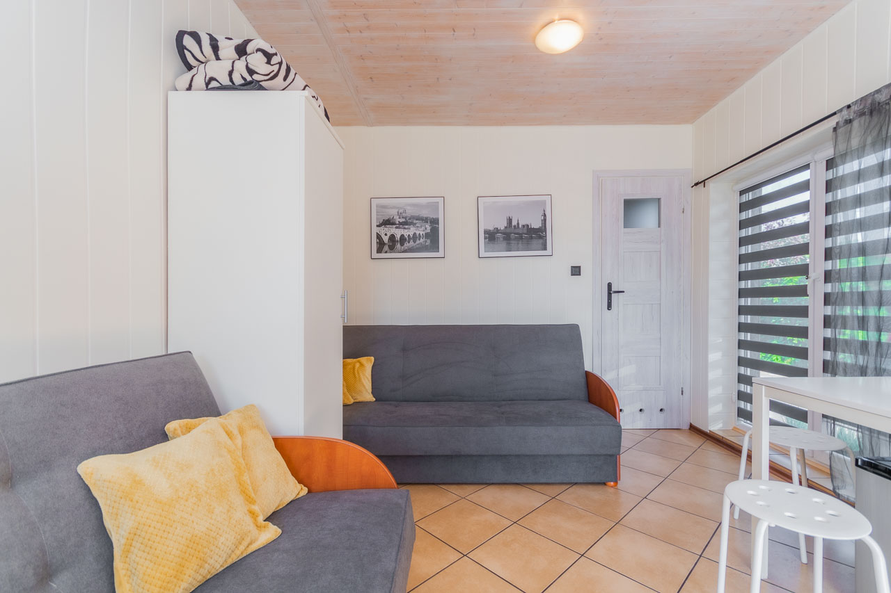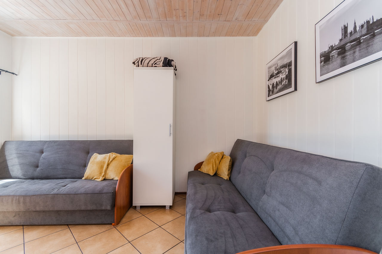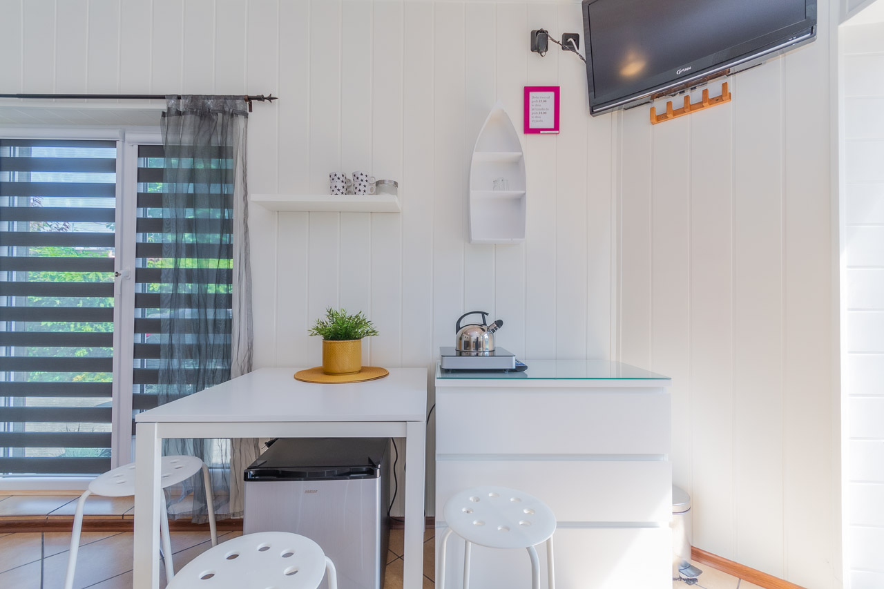 Przestronny jasny pokój przeznaczony dla czterech osób, z wyjściem od południowej stront posesji. Tuż przy drzwiach wejściowych znajduje się stół z krzesłami gdzie można korzystać z kąpieli słonecznych.